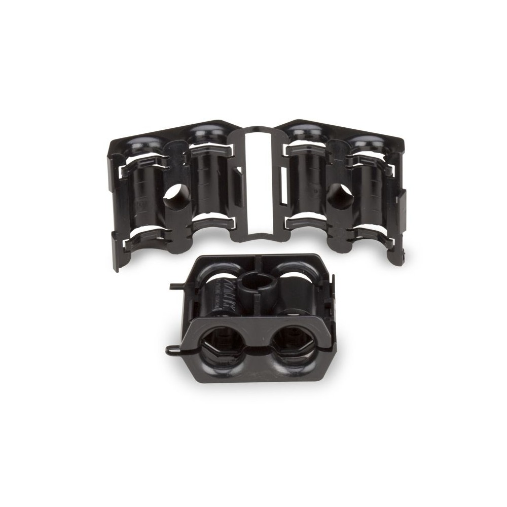 Pince de type clipsable pour deux câbles coaxiaux de 9 à 12 mm, elle possède un trou central pour le passage d'un goujon M8. Le paquet contient 10 unités